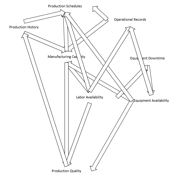 Start with Production History and Operational Records. Each of these populations of information directly affect the Manufacturing Capacity and Production Schedules. Production history dictates what is possible, operational records define what is negotiable. Buckle in the Equipment and Labor Availability and now Manufacturing Capacity becomes heavily influenced by the additional sources. For example, if labor is short, manufacturing capacity is short. If equipment is down, capacity is down. These two in combination with Manufacturing Capacity impact the Production Quality. Quality suffers or flourishes when the three primary drivers are congruently working in parallel. Production Quality in turn determines the Production History while Equipment Availability and Labor Availability influence the operational records where financial details are considered (Labor and Overhead). By understanding the DAG within the scope of my questions, I can pursue Machine Learning models that are useful.